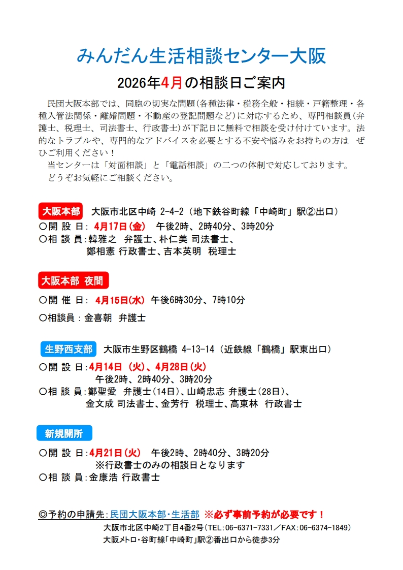 みんだん生活相談センター 4月相談日のご案内