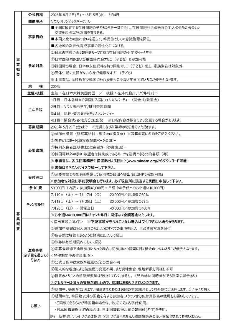 〇事 業 名:2026(第13回)在日同胞オリニジャンボリー