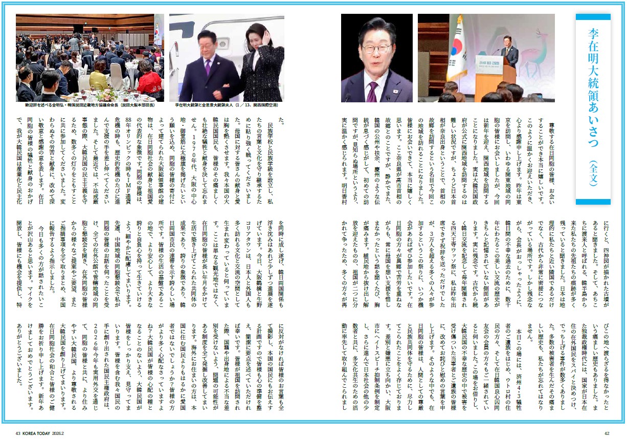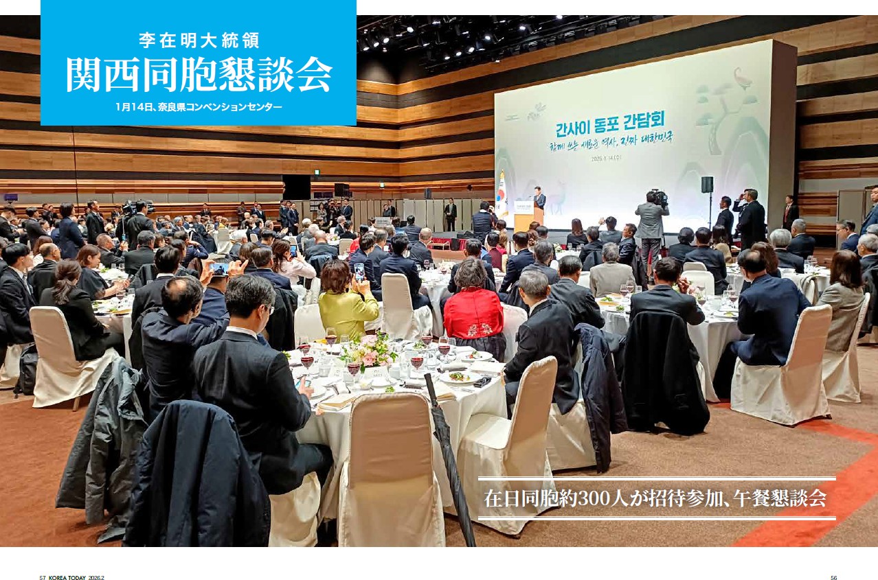 尊敬する在日同胞の皆様、お会いすることができ本当に嬉しいです。このように温かくお迎えいただき、心より感謝申し上げます。昨年は東京を訪問し、いわゆる関東地域の同胞の皆様にお会いしましたが、今回は新年を迎え、関西地域を訪問することになりました。実は大韓民国政府が公式に関西地域を訪問するのは難しい状況ですが、ちょうど日本首相が奈良出身ということで、首相の故郷を訪問するという名目で今回この地域を訪れることになりました。皆様にお会いできて、本当に嬉しく思います。ここ奈良県が高市首相の故郷とのことですが、静かでまた、韓国の公州や扶余、慶州のような伝統が息づく感じがして、初めての訪問ですが、見知らぬ場所というより、実に温かく感じられます。明日香村に行くと、四神図が描かれた古墳があると聞きました。そして、あちこちに渡来人と呼ばれる、韓半島から来た私たちの先祖たちの痕跡が多く残っていると聞きました。日本は地理的に私たちと近い隣国であるだけでなく、古代から非常に密接につながっている場所です。しかし残念ながら、会長がおっしゃったように、韓日間の不幸な過去のために、数千年にわたるこの美しい交流の歴史がきちんと記憶されていない側面があります。実に残念です。古代から続く韓日交流を記念して毎年開催される四天王寺ワッソ祭に、私は昨年出席できず祝辞を送っただけでしたが、3万人を超える多くの人々が参加するというこの祭りに、いつか機会があればぜひ参加したいです。在日同胞の方々が異郷で苦労を重ねながらも、常に母国を想い支援を惜しまなかったという話を聞くたび、胸が痛みます。植民地から抜け出し解放を迎えたものの、祖国が二つに分かれて争ったため、多くの方々が再びこの地へ渡らざるを得なかったという痛ましい歴史もありました。また独裁政権時代には、国家が日本在住の在外国民をスパイと決めつけ、でっち上げる事件が数多くありました。多数の被害者を生んだその痛ましい歴史も、私たちが忘れてはなりません。