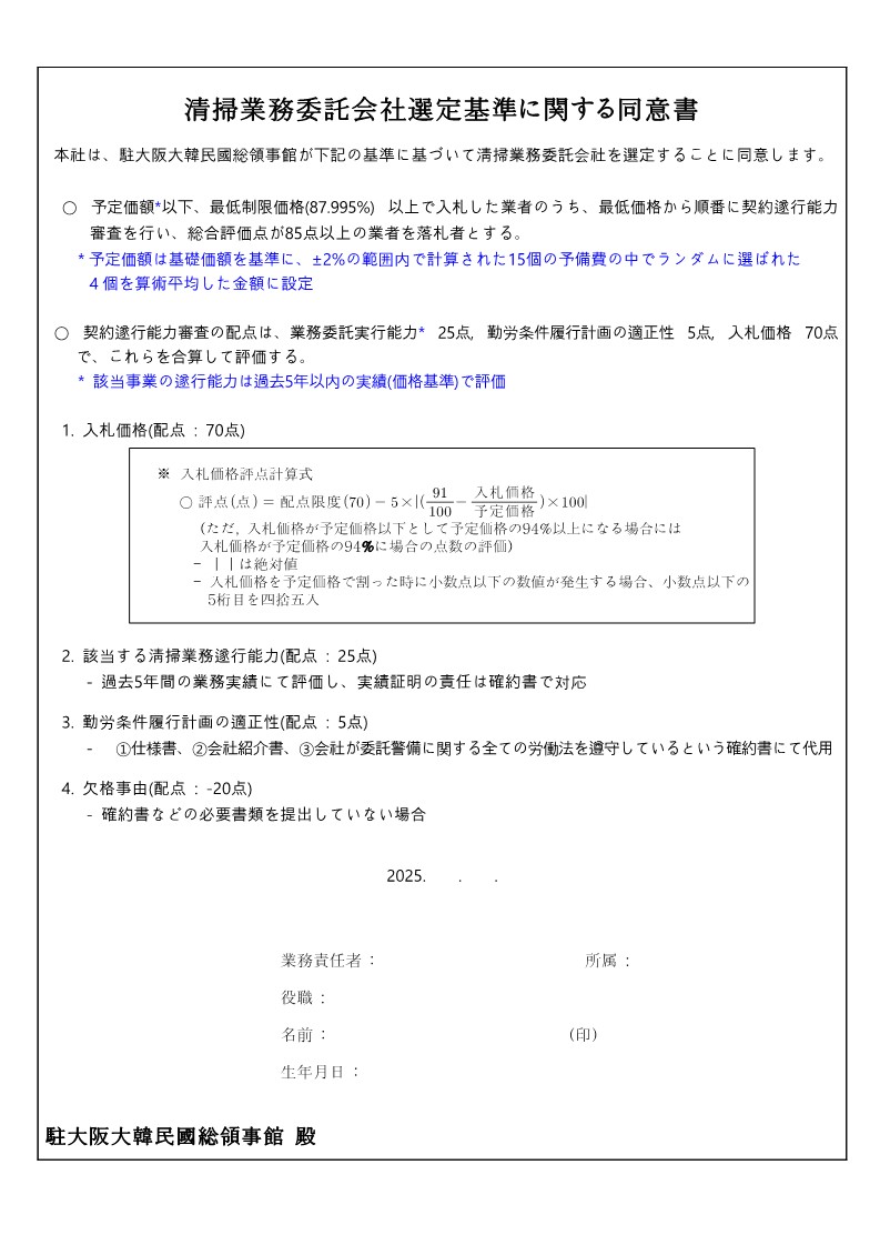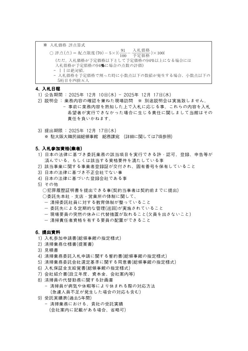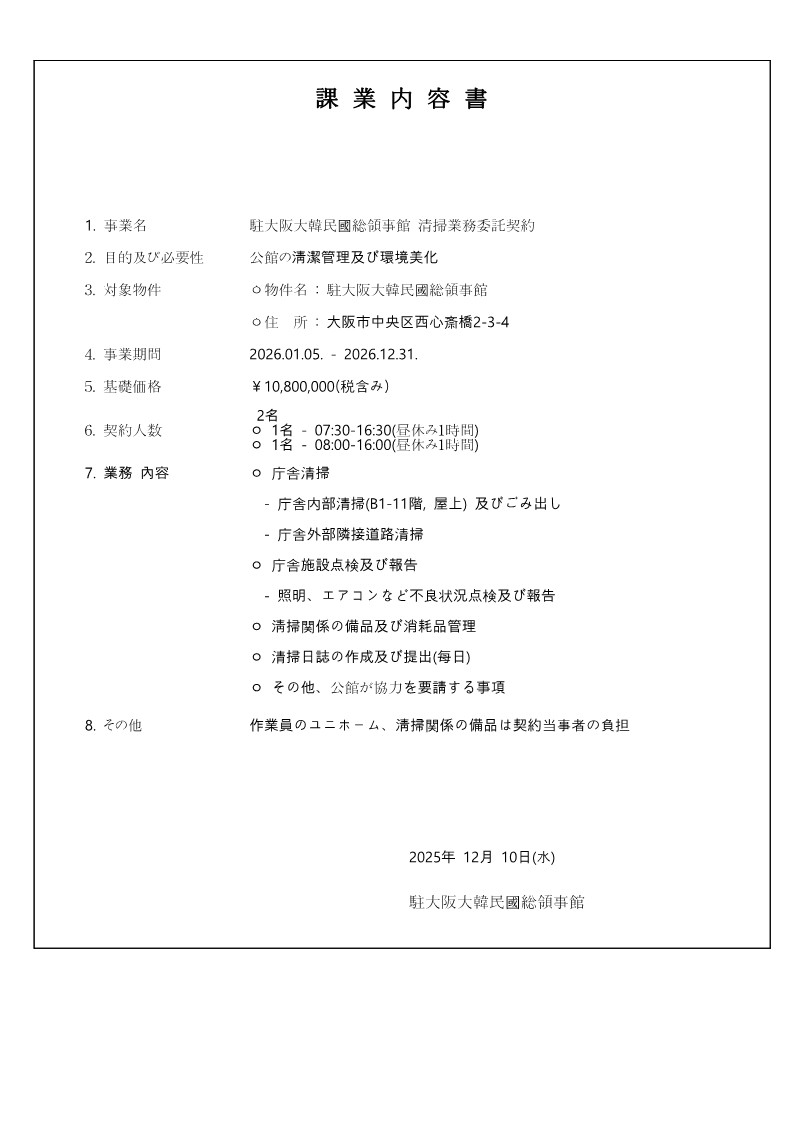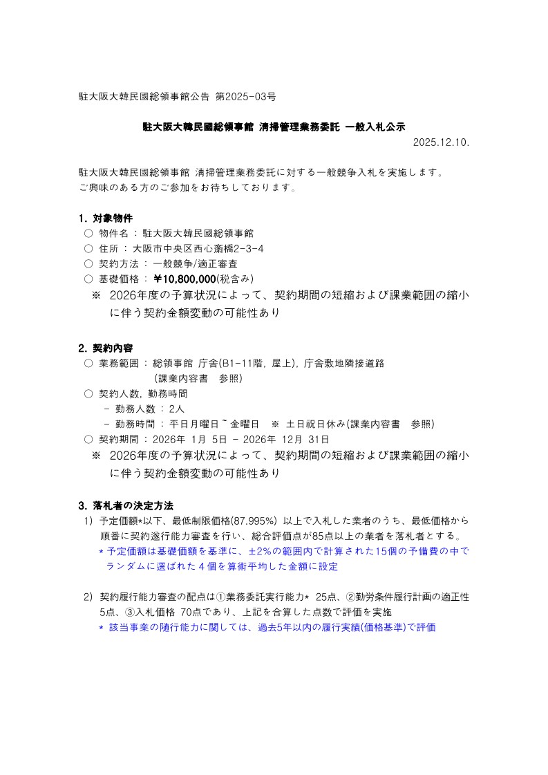 12月10日更新 (日本語)駐大阪大韓民國総領事館 清掃管理業務委託 一般入札公示のご案内