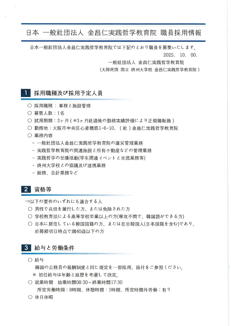 日本一般社団法人金昌仁実践哲学教育院 職員採用情報のご案内